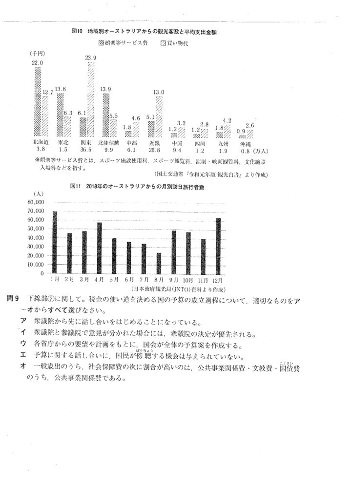 図を見ながら、問題を解き進めます。問題文の「『「買い物代』よりも『娯楽等サービス費』を多く使っている地域」は、北海道・東北・北陸信越だということが図10からわかります。図11からは、1月次いで2月にオーストラリアからの訪日旅行者数が多いことがわかります。